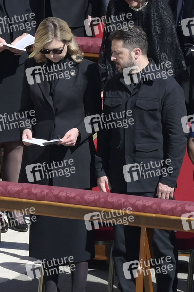 Wolodymyr Selenskyj / Volodymyr Zelenskyy mit Ehefrau Olena Selenska bei der Trauermesse für den verstorbenen Papst Franziskus auf dem Petersplatz. Vatikanstadt, 26.04.2025