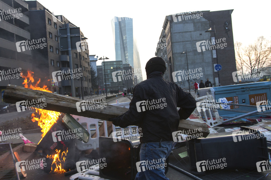 Die kapitalismuskritische Blockupy-Bewegung hat zu einem Protesttag gegen die europäische Krisenpolitik aufgerufen. Anlass ist der Festakt zur Eröffnung der neuen Zentrale der Europäischen Zentralbank (EZB). Es kommt zu Ausschreitungen und Angriffe auf Polizisten. Demonstranten versuchen, das weiträumig abgesperrte Gelände der EZB zu stürmen, werden aber von der Polizei gestoppt. Frankfurt am Main, 18.03.2015