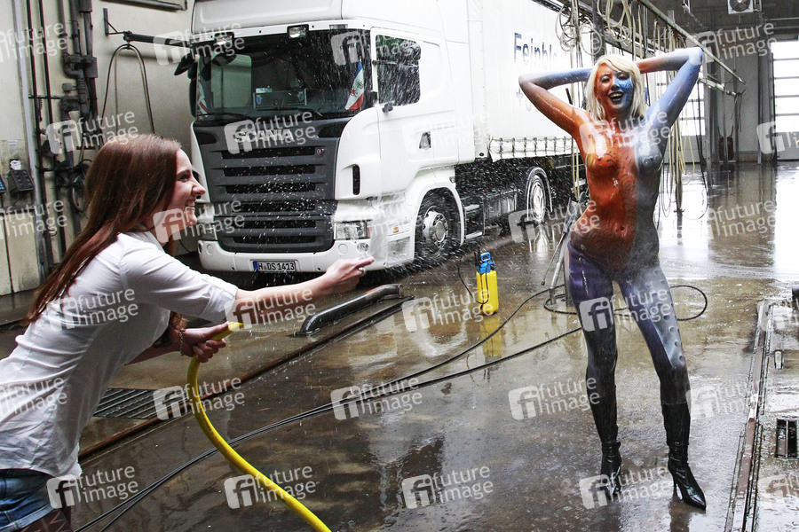Photoshooting mit den Models Anastasia, Vanessa, Melanie und Julia und dem Bodypaint Model Anastasia in einer Auto- und LKW-Waschanlage in Lauenau. Bodypaint Künstler: Jörg Düsterwald