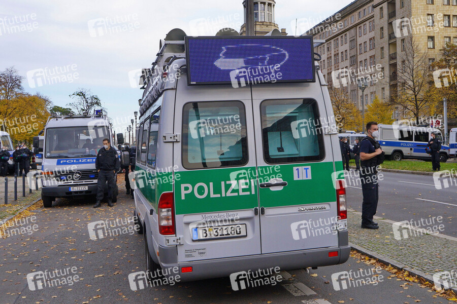 Querdenker Demonstration gegen die bestehenden Maßnahmen zur Eindämmung der Corona-Pandemie anlässlich des World Health Summit 2020 im ehemaligen Kino Kosmos auf der Karl-Marx-Allee. Wegen Nichteinhaltung der polizeilichen Auflagen wurde die Demonstration durch die Polizei beendet. Es gab Rangeleien und Festnahmen. Berlin, 25.10.2020