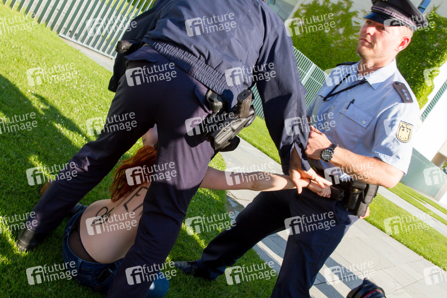 FEMEN-Aktivistinnen protestieren vor dem Bundeskanzleramt in Berlin, anlässlich des Besuchs des tunesischen Ministerpräsidenten, für die Freilassung einer in Tunesien inhaftierten Aktivistin. Berlin, 07.06.2013