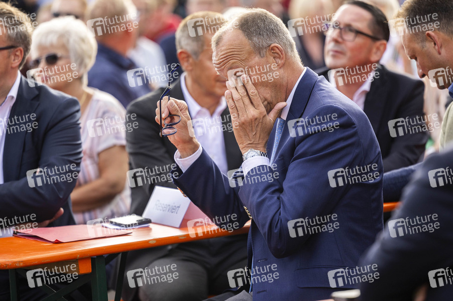 Friedrich Merz bei einer Wahlkampfveranstaltung der CDU zur Landtagswahl in Thüringen im Autohaus Peter. Erfurt, 21.08.2024