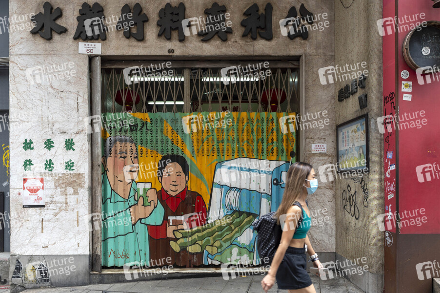 Der Einzelhandelssektor in Hongkong befindet sich in einer Krise. Die Covid-19-Pandemie hat seinen Tribut gefordert. Einige Geschäfte wie der Kung Lee Zuckerrohrsaft-Laden haben bis auf weiteres geschlossen. Das Geschäft existiert seit über 60 Jahrenund der jetzige Besitzer hofft, bald wieder zu eröffnen. Die farbigen Fensterläden des Künstlers Noble Wong sind weiterhin zu sehen .Hongkong, 11.09.2020