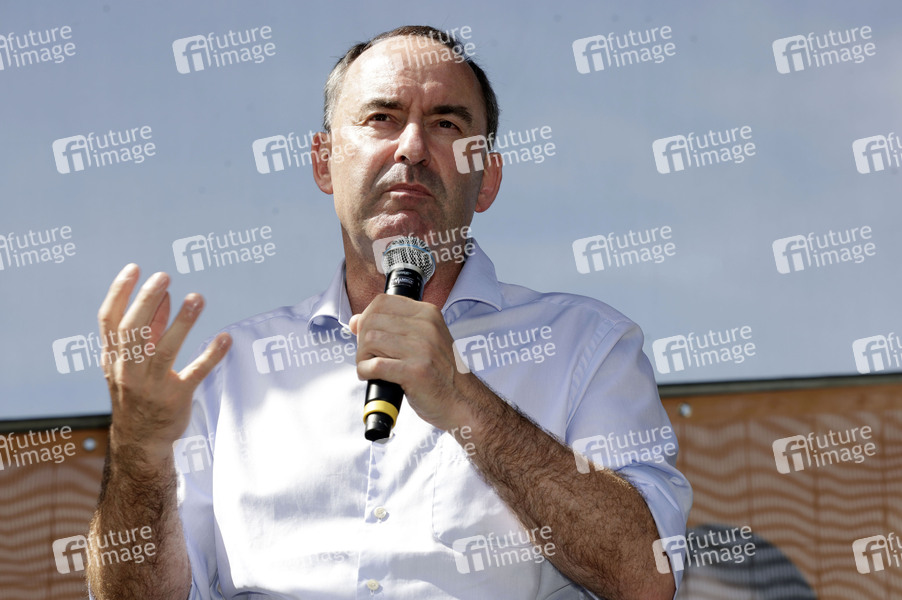 Hubert Aiwanger bei einer Wahlkampfveranstaltung der Freien Wähler Hessen auf dem Bioenergiehof 'Vor den Tannen'. Wetter, 02.09.2023