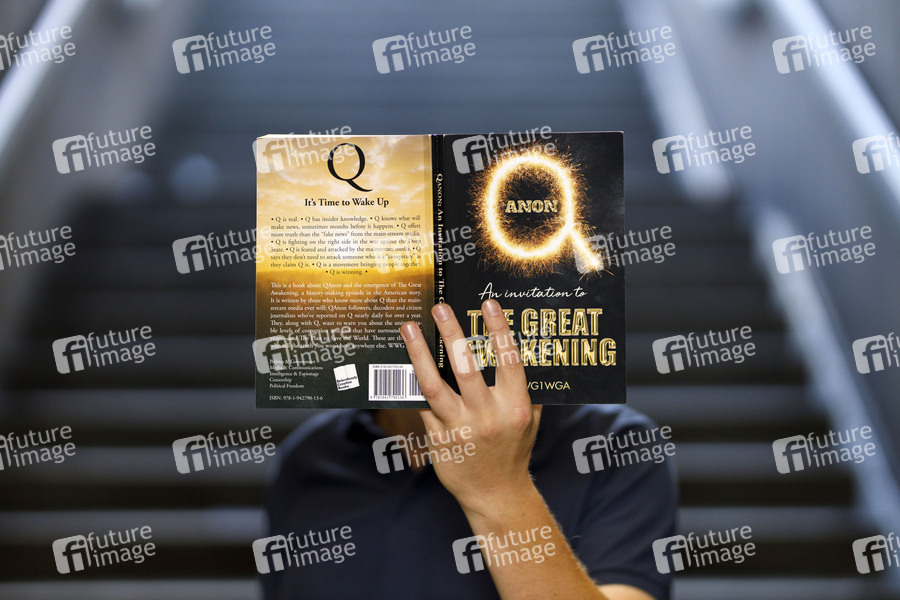Jemand verdeckt seinen Kopf mit dem Amazon-Bestseller 'Qanon - An Invitation to the Great Awakening'. Köln, 05.07.2020