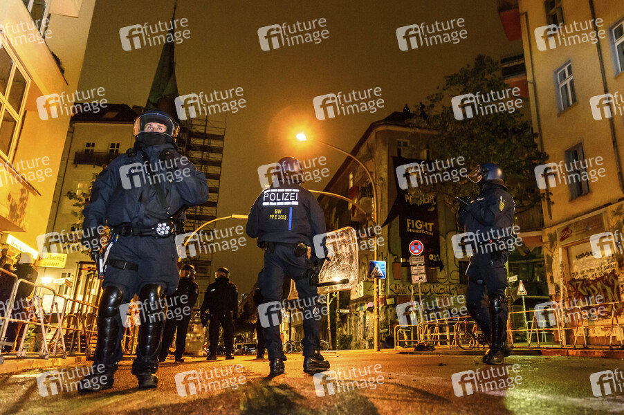 Polizisten innerhalb des Sicherheitsbereiches am Abend der bevorstehenden Räumung des queer-feministischen Hausprojekts Liebig 34 (L34) in der Liebigstraße 34 in Berlin-Friedrichshain. Berlin, 08.10.2020