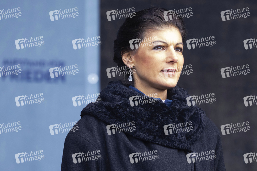 Sahra Wagenknecht auf der umstrittenen Friedensdemo und Kundgebung für Verhandlungen mit Russland statt Waffenlieferungen für die Ukraine am Brandenburger Tor. Dazu aufgerufen haben die Linken-Politikerin Sahra Wagenknecht und die Frauenrechtlerin Alice Schwarzer. Berlin, 25.02.2023