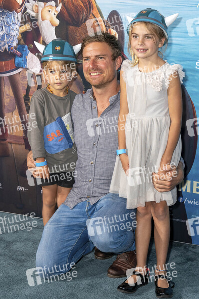 Leo Reisinger mit den Kindern Silos und Cosima bei der Deutschlandpremiere des Animationsfilms 'Wickie und die starken Männer - Das magische Schwert / Vic the Viking and the Magic Sword' in der Astor Film Lounge im ARRI-Kino. München, 21.08.2021