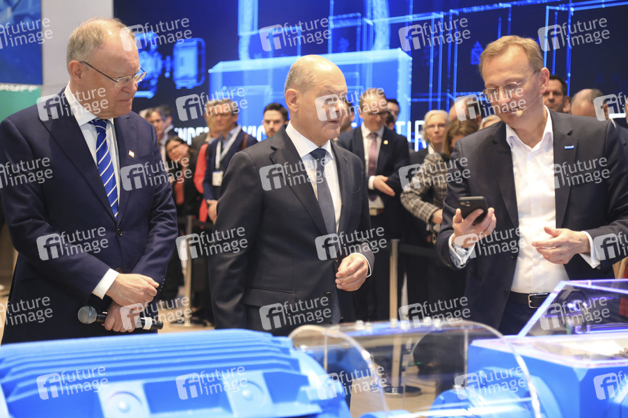 Stephan Weil, Olaf Scholz und Andreas Evertz am Stand der Firma Flender beim Eröffnungsrundgang auf der Hannover Messe 2025 auf dem Messegelände. Hannover, 31.03.2025