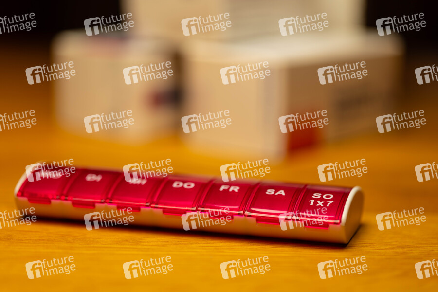 Medikamentendispenser, Tablettendose, Tablettenbox, Tablettendispenser, Medikamentenspender, Medikamentenbox, Arzneikassette, Pillendose, Pilmate, Medikamentendosierbehälter, Medikamentenschieber, Medizin, Arzneimittel, Arznei, Talbette, Tabletten, Pille, Pillen, Einnahme, Medikamente, Pharmazie, Krankheit, Arzneimittelgesetz, Medikation, Symbolbild, Themenbild