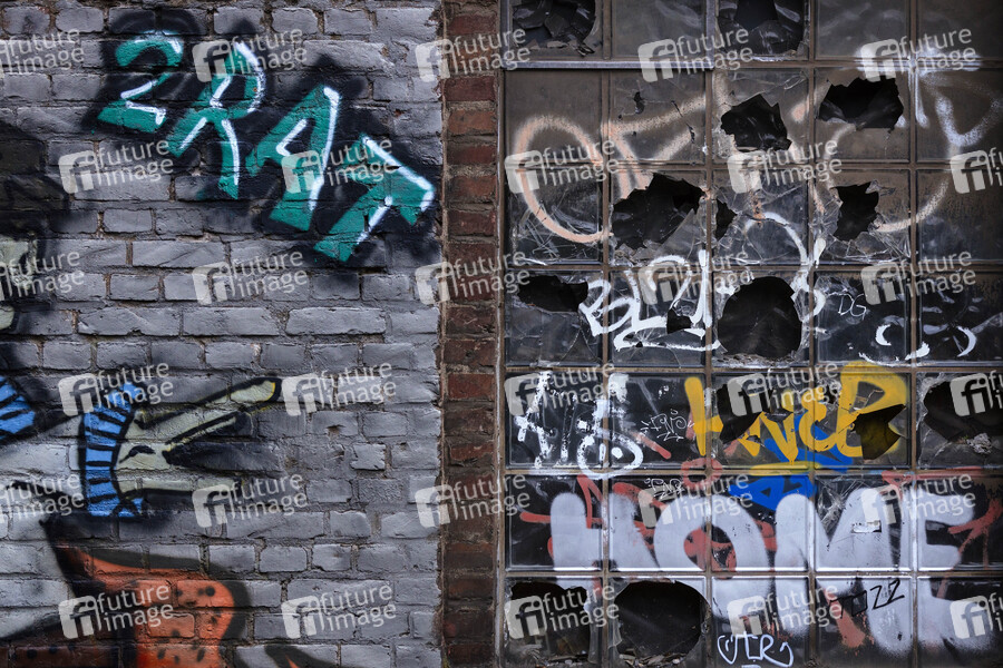 Lagerhalle, Graffiti, Fensterscheiben, eingeworfene Fenster, Ruine, heruntergekommen, Anarchie, Sachschaden, Vandalismus, Vandalentum, mutwilige Zerstörung, Sachbeschädigung, Problemviertel, Brennpunkt, Ghetto, Getto, Gettoisierung, Ghettoisierung, No-Go-Area, No-Go-Areas, Sozialer Brennpunkt, soziale Kälte, Kriminalität, Problembezirk, Verelendung, Elendsviertel, Prekariat, Armut, Milieu, Verwahrlosung, Innere Sicherheit, Sozialpolitik, Angstzone, Angstraum, Schutzgeld, Versicherungsschaden, Gebäudeversicherung, Versicherungsbetrug, Einbruch, Haftpflichtversicherung, Glasbruch, Glasversicherung, Glasschaden, Glasschäden, Schutzgeldmafia, Verfall, Unordnung, Broken-Windows-Theorie, zerbrochene Fensterscheibe, Parallelgesellschaft, Parallelgesellschaften, soziale Frage, eingeworfenes Fenster, Schadensmeldung, Fenster, Fensterglas, Glaser, Symbolbild, Symbolfoto