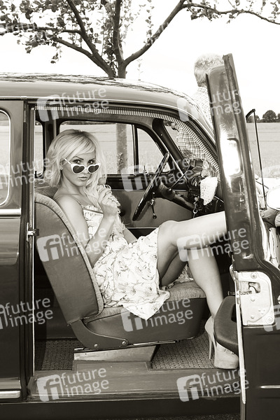 SOLsnap Cover-Model September 2011, Auto, Oldtimer, Mercedes-Benz Ponton 190 b Baujahr 1961, Erotik, sexy, Lolita, Sonnenbrille, Lolli, Lutscher, Sommerkleid