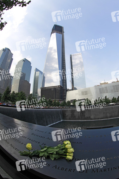 Ground Zero, World Trade Center Site, Hochhaus, Gebäude, Bauwerk, Wolkenkratzer, Architektur, Baustelle, 1 WTC, Höhe bis Dach 417 Meter, Höhe bis Spitze 541.30 Meter, 105 Etagen, Architekt David Childs, geplante Bauzeit 2006-2013, Rosen, Gedenkbrunnen