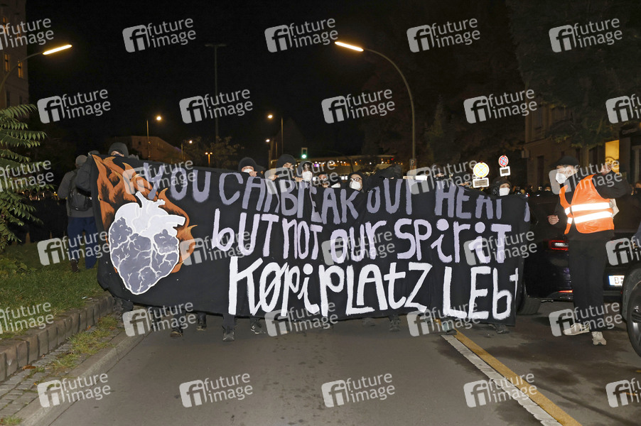 Bei einer Demo gegen die Räumung des linksautonomen Bauwagen-Camps 'Köpi' in Berlin-Kreuzberg ist es zu Ausschreitungen gekommen. Dabei wurden Polizisten mit Flaschen, Steinen und Feuerwerkskörpern beworfen. Unbekannte haben in der Reichenbergerstraße Scheiben mehrerer Autos zerschlagen, Verkehrsschilder in parkende Autos gerammt und Dixieklos umgeschubst. Laut Polizei waren 7.000 bis 8.000 Teilnehmer vor Ort. Berlin, 15.10.2021