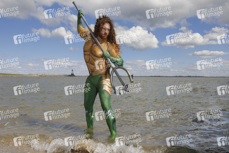 Cosplay, Cosplayer, Bodypainting, Body-Painting, Make-up, Latexappliaktionen, Latexteile, Maskenbildnerei, Maskenbildner Körperkunst, Körperfarben, Projekt Farbkörper, Farbe, Bemalung, Kunst, Malerei, Wassermann, DC, Atlantis, Meer, Wasser, Strand, Nordsee, Bucht, Meeresbucht, body painting, body art, project color body, colors, aquarius, sea, water, beach, bay, North Sea