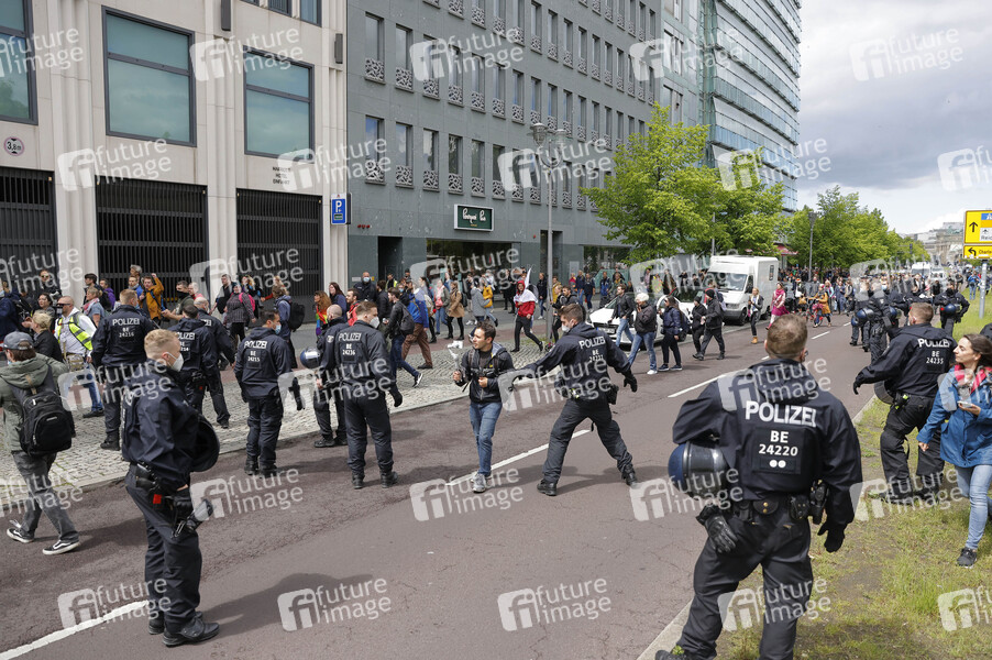 Am Brandenburger Tor haben sich am Mittag mehrere Hundert Kritiker der Corona-Politik der Bundesregierung versammelt. Nach dem Verbot von zwei großen Demonstrationen von Gegnern der Corona-Politik in Berlin hat die Polizei mit Gittern das Brandenburger Tor abgesperrt und Platzverweise erteilt.Die Polizei nimmt mehrere Demo-Teilnehmer fest und es stehen Wasserwerfer bereit. Kleinere Ansammlungen nahe des Potsdamer Platzes und in der Voßstraße wurden aufgelöst. Ein Demonstrationszug verlagert sich zur Leipziger Straße. Berlin, 22.05.2021