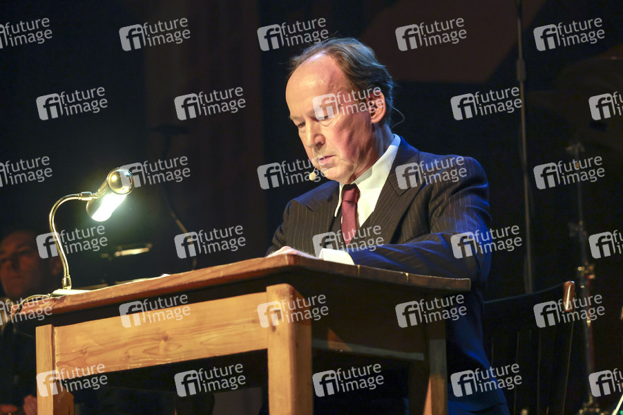 Ulrich Noethen und das Moka Efti Orchestra bei der musikalischen Lesung 'Der nasse Fisch' im Theater am Tanzbrunnen. Köln, 12.03.2025