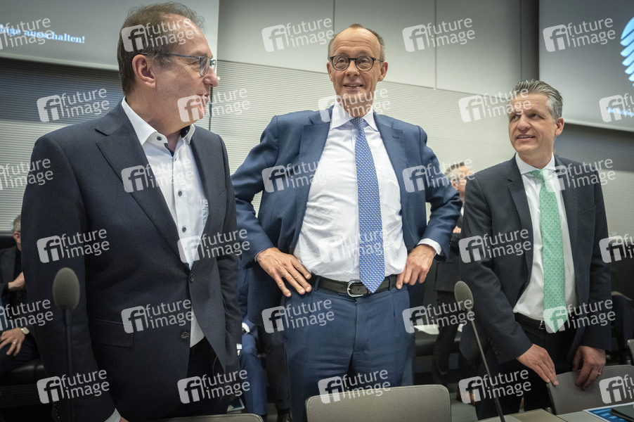 Alexander Dobrindt, Friedrich Merz und Thorsten Frei in der Fraktionssitzung der CDU/CSU-Bundestagsfraktion im Reichstagsgebäude. Berlin, 10.02.2025