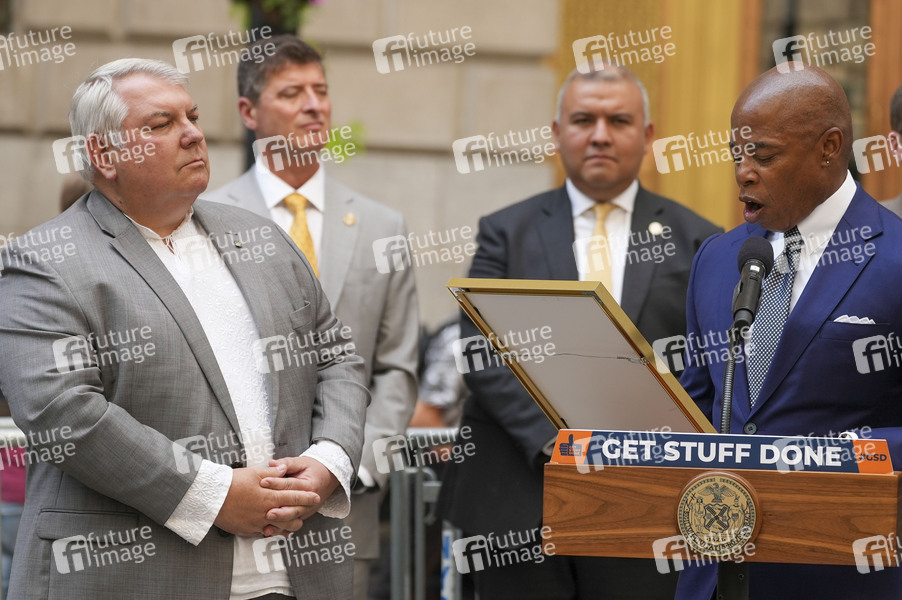 Oleksii Holubov und Eric Adams bei der Zeremonie zum Hissen der Flagge der Ukraine anlässlich des 31. Unabhängigkeitstages der Ukraine in Bowling Green. New York, 24.08.2022