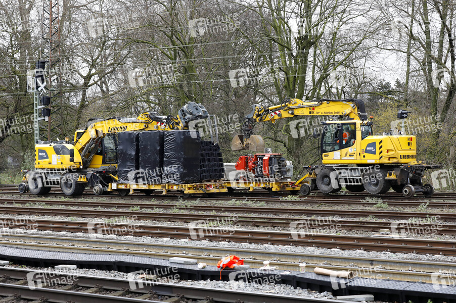 Zweiwegebagger beim Fototermin 'Endspurt für das Elektronische Stellwerk (ESTW) Linker Rhein' am Bahnhof Köln-West. Köln, 13.03.2024