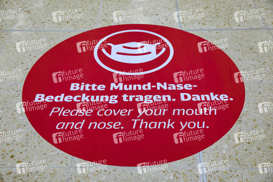 Bahnanschluss mit Hinweis auf Maskenpflicht am Bahnsteig am Flughafen Berlin Brandenburg (BER). Schönefeld; 01.11.2020