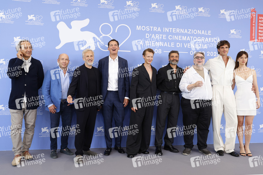 Alexandre Desplat, J. Miles Dale, Christoph Waltz, Scott Stuber, Felix Kammerer, Oscar Isaac, Guillermo del Toro, Jacob Elordi und Mia Goth beim Photocall zum Kinofilm 'Frankenstein' auf der Biennale di Venezia 2025 / 82. Internationale Filmfestspiele von Venedig im Palazzo del Casino. Venedig, 30.08.2025