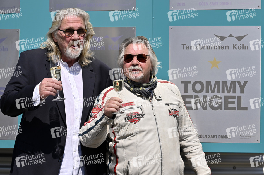 Jürgen Fritz und Tommy Engel beim Pressetermin zu Tommy Engels 10. Jubiläum als Solokünstler mit der Enthüllung seiner Ehrentafel an der Wall of Fame am Theater am Tanzbrunnen. Köln, 28.04.2022