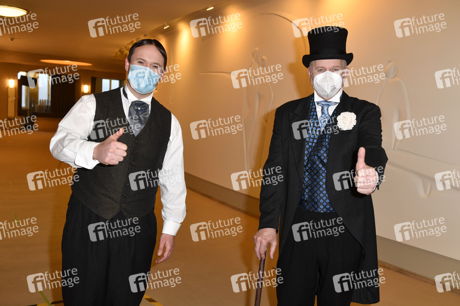 Lorris Andre Blazejewski und Peer Martiny beim Fototermin mit dem (getesteten) Ensemble des Theaterstücks 'Vorhang auf für Cyrano' in Maske und Kostüm vor dem Testzentrum im Schiller Theater. Unter dem Motto 'Testen statt spielen' eröffnen die Komödie am Kurfürstendamm und der KitKatclub ein gemeinsames Testzentrum im Schiller Theater. Berlin, 07.04.2021
