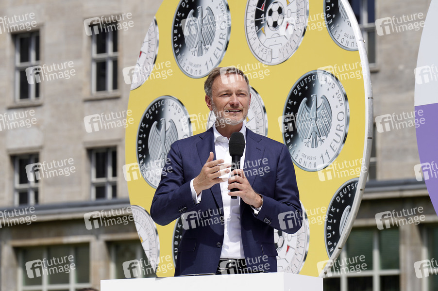 Christian Lindner bei der Präsentation des Sonderpostwertzeichens und der 11-Euro-Sammlermünze UEFA Fußball-Europameisterschaft 2024 im Bundesministerium der Finanzen. Berlin, 21.05.2024