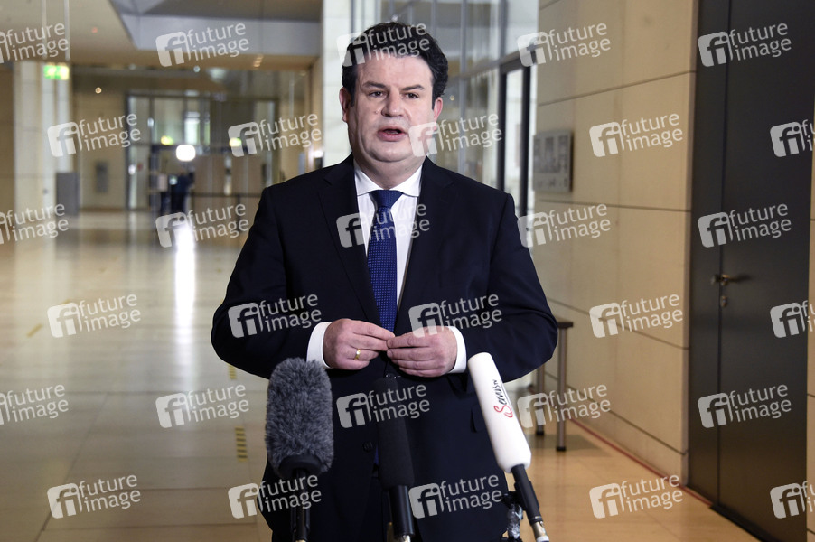 Arbeitsminister Hubertus Heil beim Pressestatement zur Verteilung von FFP2-Masken an Hartz-IV-Empfänger am Rande der 206. Sitzung des Deutschen Bundestages in der 'Westlobby', dem Aufenthaltsbereich vor dem Plenarsaal auf der Westseite im Reichstagsgebäude. Berlin, 28.01.2021