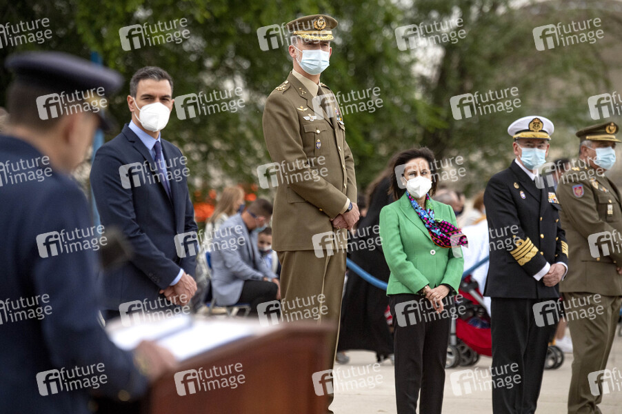 Pedro Sanchez, König Felipe VI. von Spanien und Margarita Robles beim Ehrenempfang auf der Torrejón Air Base für die letzten Soldaten die aus ihrem Einsatz in Afghanistan zurück kommen,. Die Beteiligung Spaniens am Krieg in Afghanistan begann am 27. Dezember 2001. Torrejón de Ardoz, 13.05.2021