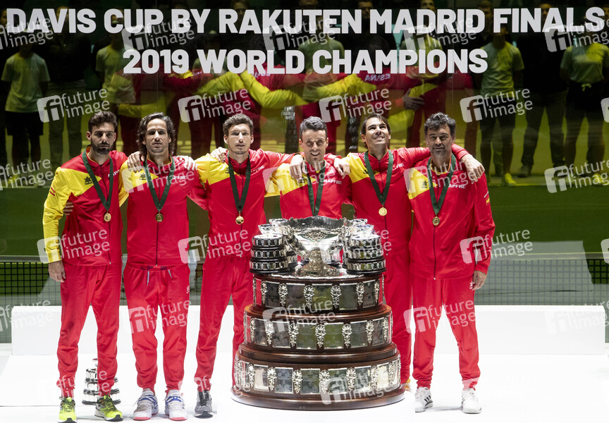 Marcel Granollers, Feliciano Lopez, Pablo Carreno Busta, Roberto Bautista Agut, Rafael Nadal und Sergi Bruguera beim Davis Cup Finale 2019 Spanien gegen Kanada im Sportkomplex Caja Mágica. Madrid, 24.11.2019