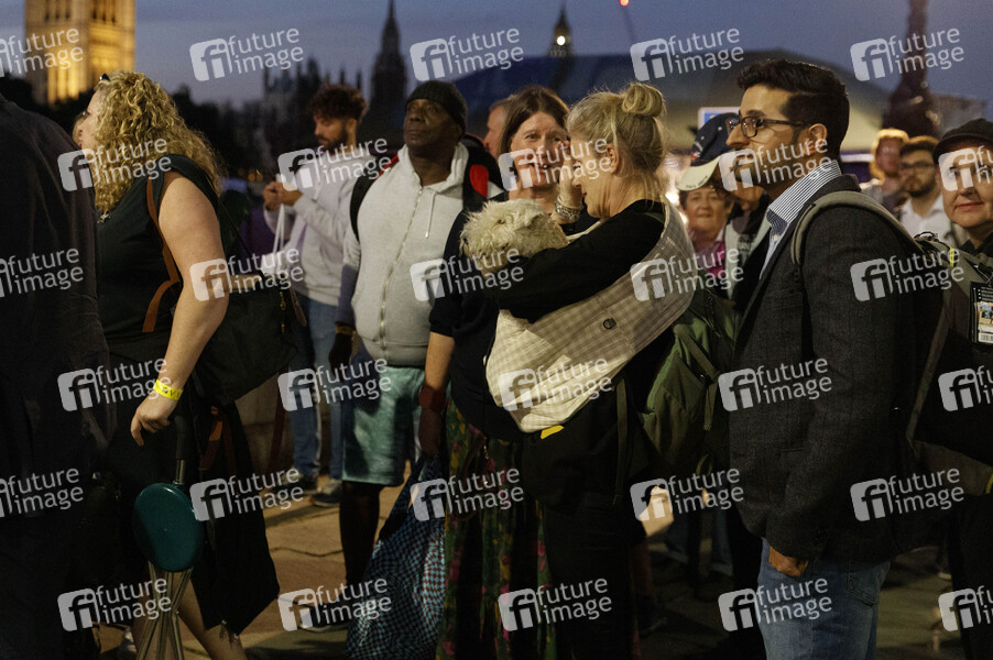 Menschschlange vor dem Londoner Parlament. Seit dem frühen Mittwochabend ist die Westminster Hall, in der der geschlossene Sarg der Queen aufgebahrt ist, durchgehend für die Öffentlichkeit geöffnet, damit sich die Landsleute von der gestorbenen Queen Elizabeth II verabschieden können. Schon zu Beginn zog sich eine Warteschlange etwa vier Kilometer weit durch das Zentrum der britischen Hauptstadt. Es wird mit Wartezeiten von bis zu 30 Stunden gerechnet. Angesichts der langen Wartezeit stehen Hunderte Helfer, Polizisten und Sanitäter bereit. Der Leichnam der Queen soll noch bis zur Trauerfeier am 19.09. aufgebahrt bleiben. London, 14.09.2022