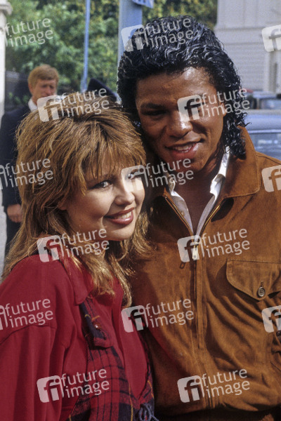 Pia Zadora und Jermaine Jackson beim Photocall vor einem Hotel. London, 10.09.1984