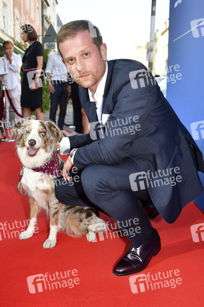 Christoph Schechinger mit Filmhund Käthe beim ARD Degeto Empfang auf dem 37. Filmfest München 2019 im Kaisergarten. München, 28.06.2019