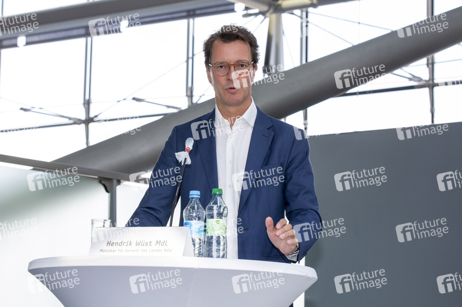 Hendrik Wüst bei der Vorstellung einer technischen Machbarkeitsstudie zum Einsatz bemannter Flugtaxen am Köln Bonn Airport. Köln, 22.07.2020