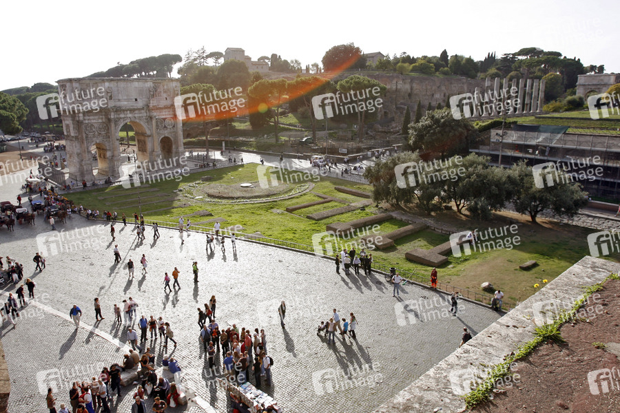 dreitoriger Triumphbogen, wurde zu Ehren des Kaisers Konstantin in Erinnerung an dessen Sieg bei der Milvischen Brücke (312 n. Chr.) über seinen Widersacher Maxentius errichtet, 312 begonnen und am 25. Juli 315 geweiht, 21 Meter hoch, 25.7 Meter breit, Durchgangstiefe 7 Meter
