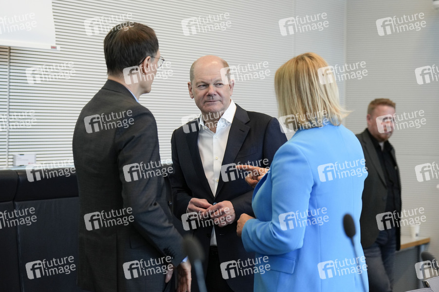Karl Lauterbach, Olaf Scholz und Nancy Faeser bei der Fraktionssitzung der SPD-Bundestagsfraktion im Reichstagsgebäude. Berlin, 23.04.2024