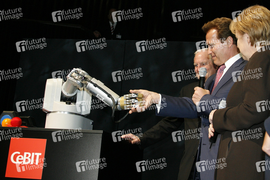 Craig Barrett, Arnold Schwarzenegger, Angela Merkel mit Roboter Marvin