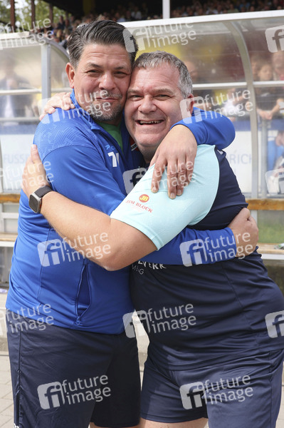 Tim Mälzer und Elton beim Benefiz-Fußballspiel 'Kicken mit Herz' 2023 zu Gunsten des Herzzentrums des UKE im Stadiun Hoheluft. Hamburg, 03.09.2023
