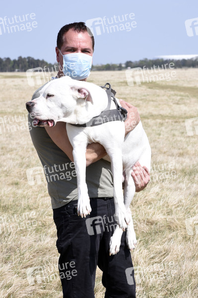 Dave Kaufmann mit seinem Hund Dean Martin bei einem exklusiven Fototerin während eines Spaziergangs. München, 17.04.2020