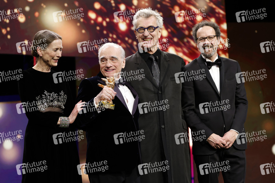 Mariette Rissenbeek, Wim Wenders, Martin Scorsese undCarlo Chatrian bei der Verleihung des Goldenen Ehrenbären an Martin Scorsese auf der Berlinale 2024 / 74. Internationale Filmfestspiele Berlin im Berlinale Palast. Berlin, 20.02.2024