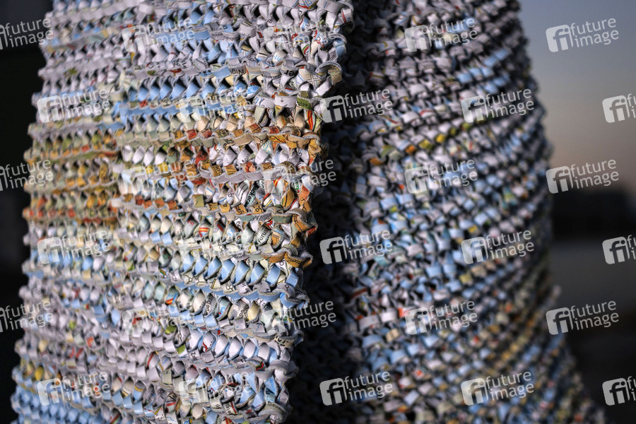Mona Chen in ihrem Kunstwerk Body Container an der Grenze von Hongkong zu Festlandchina. Sie ist eine international anerkannte Künstlerin aus Hongkong, die mit ihrer charakteristischen Technik des Verstrickens von geschredderten Texten Verbindungen über Grenzen hinweg herstellt und weggeworfene Materialien in tragbare Skulpturen verwandelt. Ihre Arbeiten kombinieren Elemente aus Mode, Performance und Skulptur. Hongkong, 12.02.2024