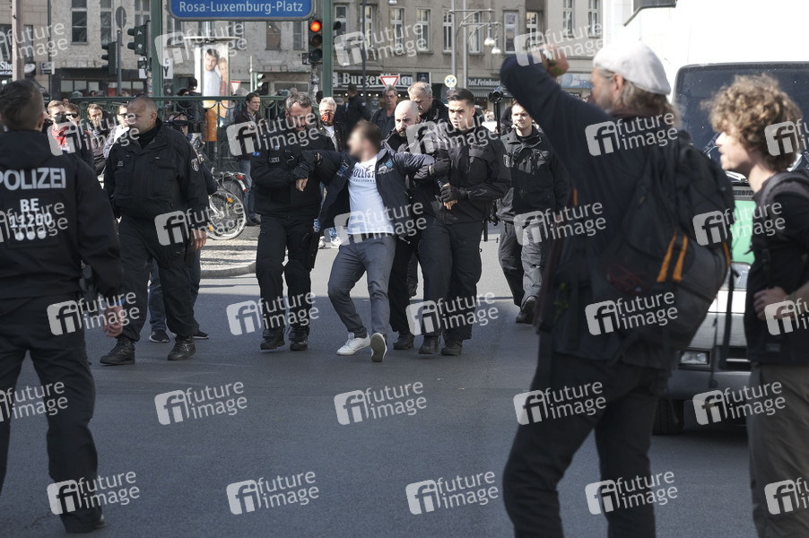 Prostest der 'Kommunikationsstelle Demokratischer Widerstand Berlin' gegen die Einschränkung der Grundrechte durch Eindämmungsverordnung der COVID-19-Pandemie im Rahmen Infektionsschutzes vor der Berliner Volksbühne. Diese 6. Hygienedemo war nicht angemeldet und von der Polizei nicht genehmigt. Der Antreteplatz rund um die Berliner Volksbühne war weiträumig abgesperrt. Die Polizei nahm mehrere Personen fest. An dem Protest beteiligten sich auch eine Reihe von Verschwörungstheoretikern aber auch rechte Gruppierungen. Berlin, 01.05.2020