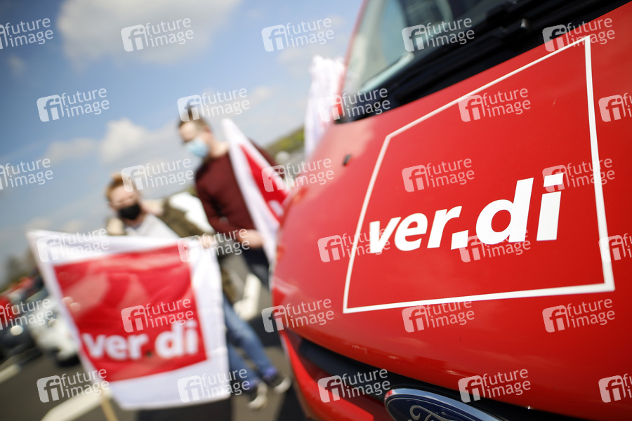 Fahnen von Ver.di bei der Kundgebung des NRW DGB zum Ersten Mai im Autokino an der Merkur Arena. Düsseldorf, 01.05.2021