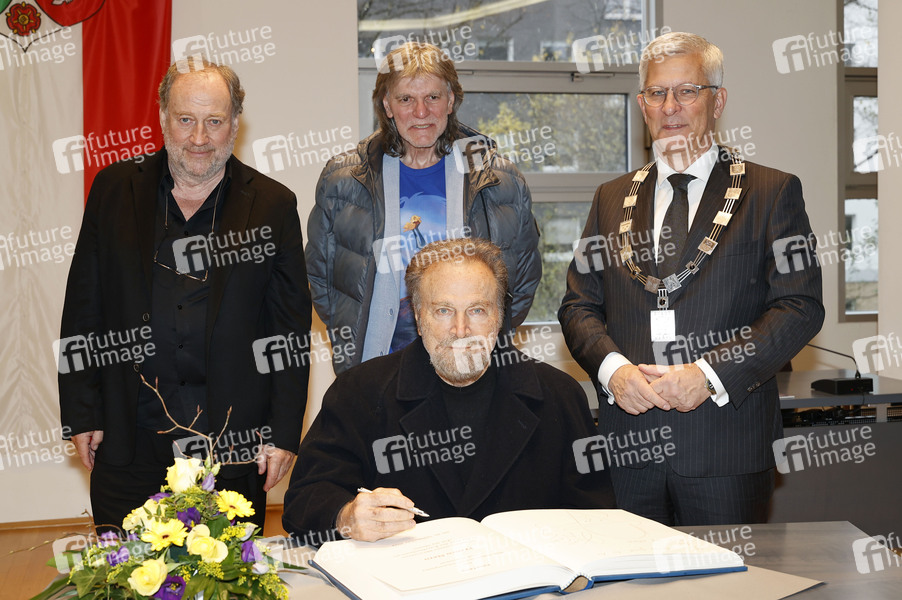 Harold Faltermeyer, Bernhard Steinkühler, Franco Nero und Erik O. Schulz beim Eintrag ins Goldene Buch der Stadt Hagen im Rathaus im Rahmen des 11. Eat My Shorts - Hagener Kurzfilmfestivals. Hagen, 16.11.2024