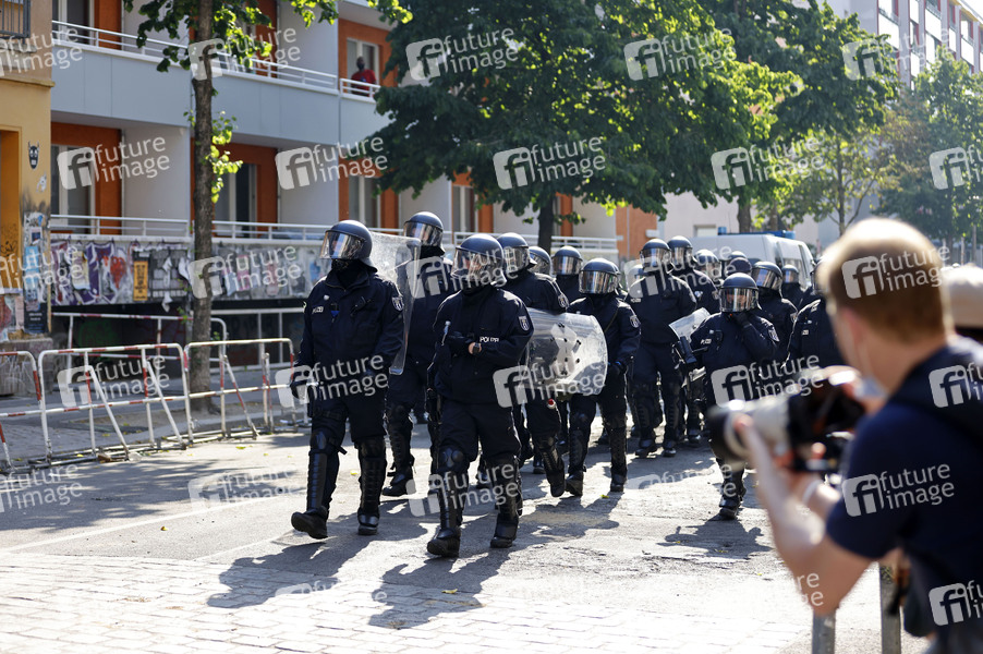 Im teilbesetzten Haus in der Rigaer Straße 94 sollte am Donnerstag der Brandschutz überprüft werden. Nachdem die Bewohner sich zunächst weigerten, die Tür zu öffnen, verschaffte sich die Polizei gewaltsam Zutritt und wurde mit Farbe beworfen. (Quelle: rbb online) Berlin, 17.06.2021
