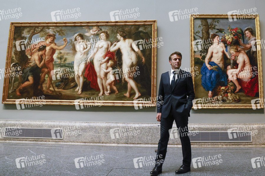 Emmauel Macron bei der Ankunft zu einem informellen transatlantischen Abendessen der NATO Staats- und Regierungschefs im Prado-Museum. Madrid, 29.06.2022