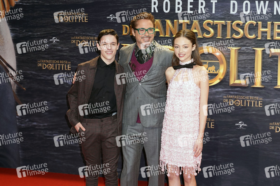Harry Collet, Robert Downey Jr. und Carmel Laniado bei der Premiere des Kinofilms 'Die fantastische Reise des Dr. Dolittle' im Zoo Palast. Berlin, 19.01.2020