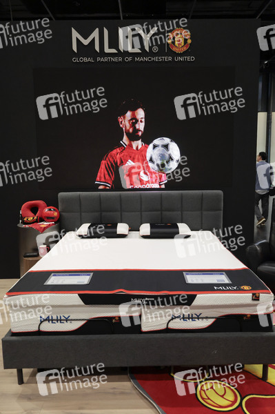 Doppelbett mit Logos 'United' beim Presserundgang zur Eröffnung der imm cologne - World of Interiors, der Fachmesse für Möbel und Innenraumgestaltung, in der Koelnmesse, Köln, 20.01.2026